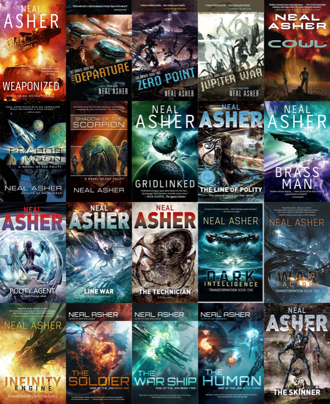 Neal Asher (born 4 February 1961 in Billericay, Essex, England) is an English science fiction writer. Both his parents are educators and science fiction fans. Although he began writing Science Fiction and Fantasy in secondary school, Asher did not turn seriously to writing until he was 25. He worked as a machinist and machine programmer from 1979 to 1987 and as a gardener from 1979 to 1987. He published his first short story in 1989. His novel Gridlinked was published in 2001, the first in a series of novels made up of Gridlinked, The Line of Polity, Brass Man, Polity Agent, and Line War. The majority of Asher's novels and most of his short fiction are all set within one future history, known as the "Polity" universe. The Polity encompasses many classic science fiction tropes including world-ruling artificial intelligences, androids, hive minds and aliens. His novels are characterized by fast paced action and violent encounters. While his work is frequently epic in scope and thus nominally space opera, its graphic and aggressive tone is more akin to cyberpunk. When combined with the way that Asher's main characters are usually acting to preserve social order or improve their society (rather than disrupt a society they are estranged from), these influences could place his work in the subgenre known as postcyberpunk. He is published by Tor, an imprint of Pan Macmillan, in the UK. He is published by Tor Books in the United States.