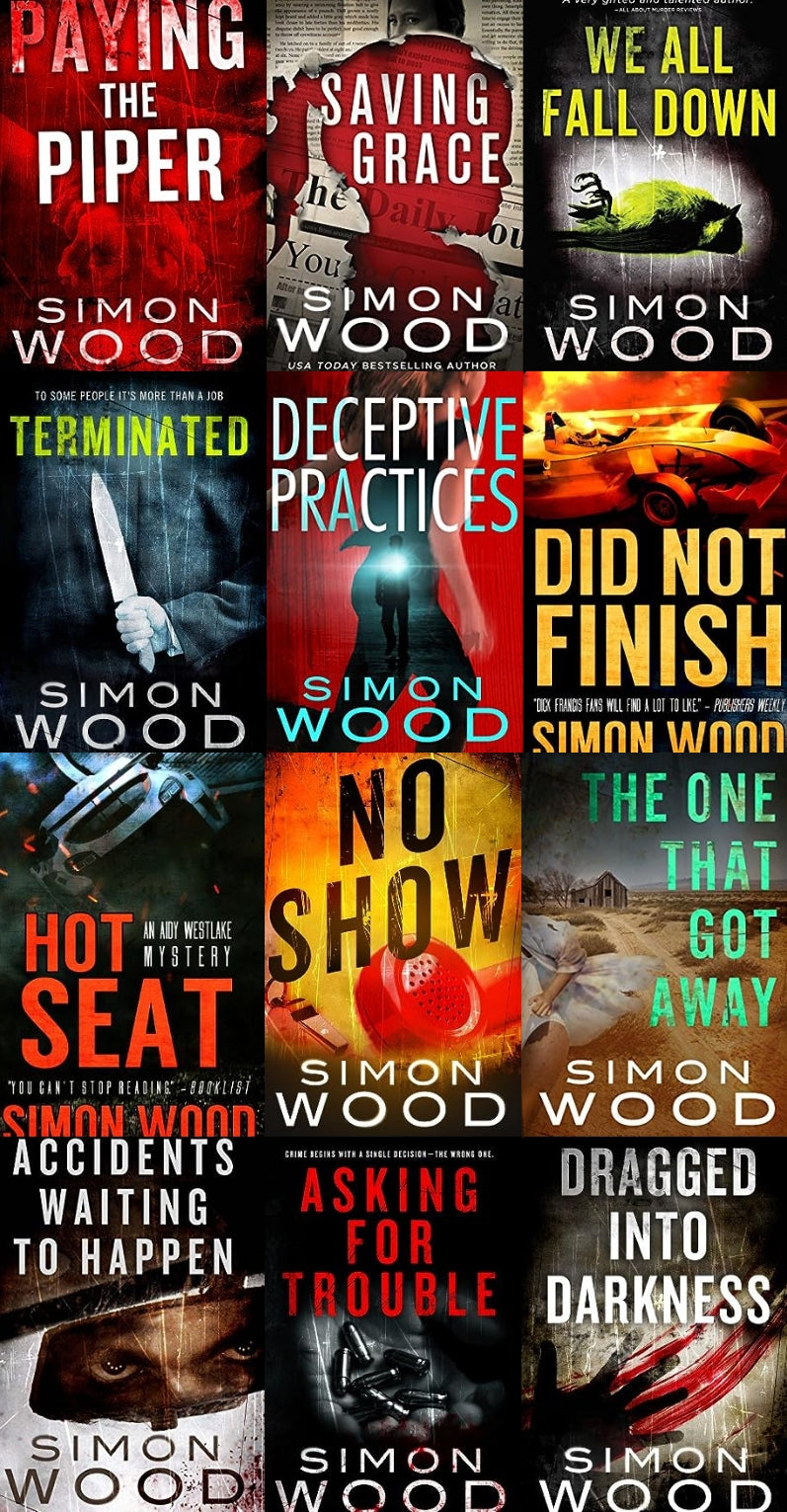 Simon Wood is a California transplant from England. He's an ex-competitive racecar driver, a licensed pilot and an occasional private investigator. He shares his world with his American wife, Julie. Their lives are dominated by a longhaired dachshund and five cats. In the last ten years, he's had over 150 stories and articles published. His stories have been included in “Best of” anthologies and he's a frequent contributor to Writer’s Digest. He's the Anthony Award winner and a Crime Writers Dagger Award finalist. He's the author of Working Stiffs, Accidents Waiting to Happen, Paying the Piper, Terminated, We All Fall Down, Asking For Trouble, The Fall Guy, Hot Seat and Did Not Finish. His next thriller is, The One That Got Away due out in February 2014. He also writes horror under the pen name of Simon Janus. Those titles include The Scrubs and Road Rash.