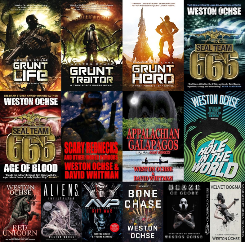 Weston OchseThe American Library Association calls Weston Ochse “one of the major horror authors of the 21 st Century.” He has been praised by USA Today, The Atlantic, The New York Post, The Financial Times of London, Publishers Weekly, Peter Straub, Joe Lansdale, Jon Maberry, Kevin J. Anderson, David Gerrold, William C. Dietz, Tim Lebbon, Christopher Golden, and many more of the world’s best-selling authors. His work has won the Bram Stoker Award, been nominated for the Pushcart Prize, and won multiple New Mexico Arizona Book Awards. A writer of nearly thirty books in multiple genres, his military supernatural series SEAL Team 666 has been optioned to be a movie starring Dwayne Johnson and his military sci fi trilogy, which starts with Grunt Life, has been praised for its PTSD-positive depiction of soldiers at peace and at war. Weston has also published literary fiction, poetry, comics, and non-fiction articles. His shorter work has appeared in DC Comics, IDW Comics, Soldier of Fortune Magazine, Cemetery Dance, and peered literary journals. His franchise work includes the X-Files, Predator, Aliens, Hellboy, Clive Barker’s Midian, and V-Wars. Weston holds a Master of Fine Arts in Creative Writing and teaches at Southern New Hampshire University. He lives in Arizona with his wife, and fellow author, Yvonne Navarro and their Great Danes.
